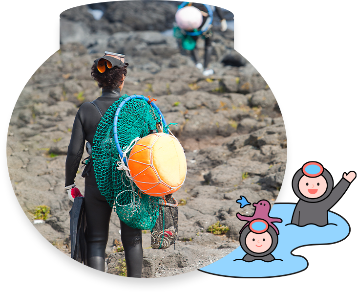 在沒有配置氧氣瓶的狀況下,潛入海裡捕撈海鮮的傳統職業女性,濟州海女文化於2016年被聯合國教科文組織列入人類非物質文化遺產。