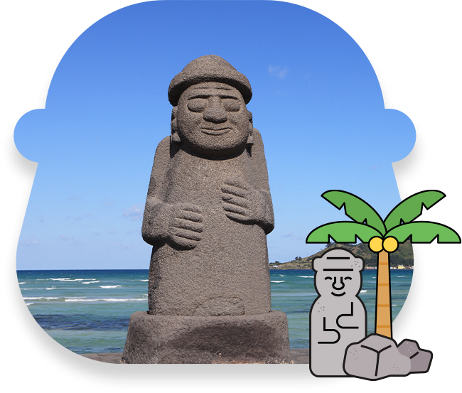 石頭爺爺是用當地盛產的玄武岩所雕刻的石頭像,通常會立在濟州島城門前,代表濟州的吉祥物, 圓形烏紗帽、豐滿的臉蛋、寬闊的鼻子、雙手恭敬地握在胸前是其特點。