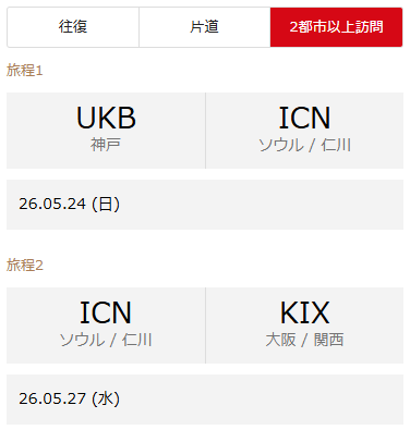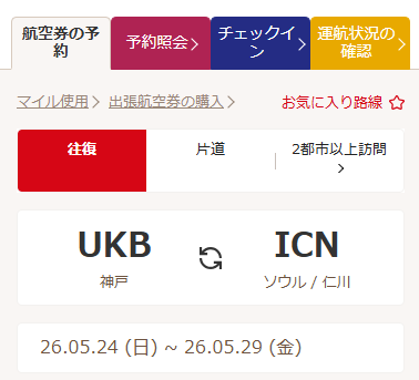 | 5/29(金) | 仁川→神戸 | OZ1163 | 12:40 | 14:35 |