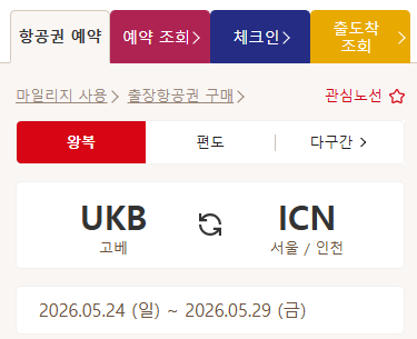 ※인천-고베 노선 부정기편 전체 스케줄 안내이며, 5/24(OZ1153) 및 5/29(OZ1163) 운항 편에 한하여 온라인 예약이 가능합니다.