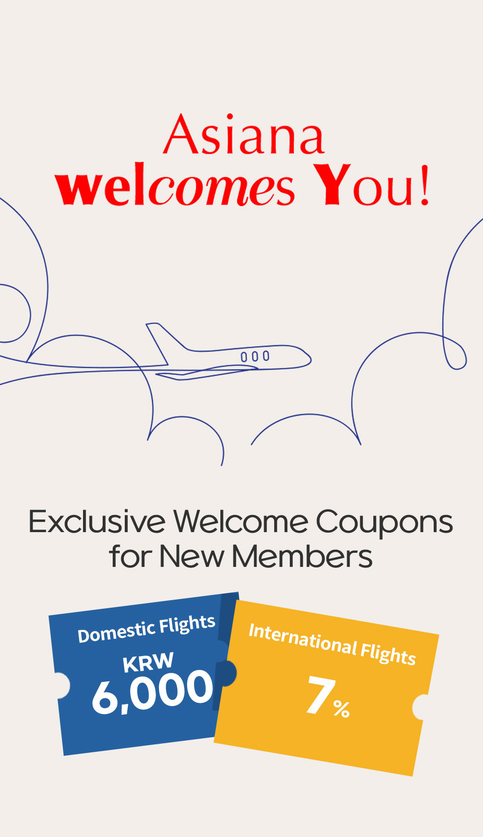• This coupon is valid for a single use during the new ticket purchase and payment process after logging in on flyasiana.com (PC, Mobile, or App).