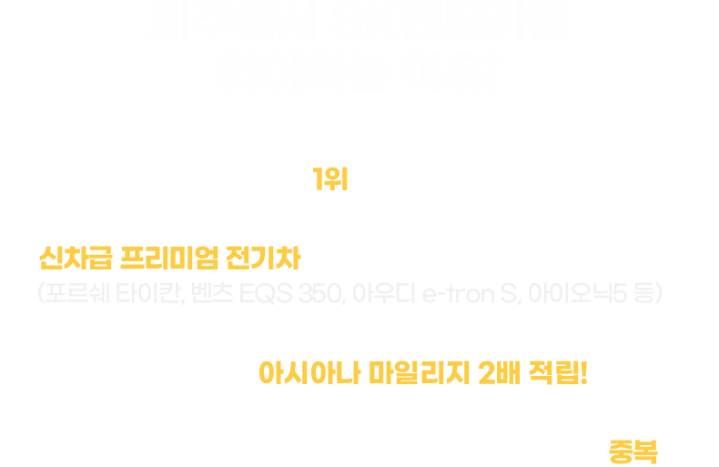 • SK렌터카 회원가입 후 예약하시면 회원할인&아시아나 제휴할인& ‘마일리지 2배 적립’ 모두 적용 가능하며 SK렌터카 기타 제휴 할인과 중복은 불가합니다.