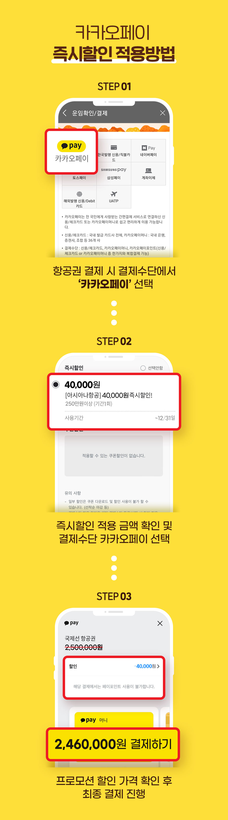 • 할인 적용금액은 카카오페이 결제창 내 ‘할인’ 및 상세 보기를 통해 확인 가능합니다.