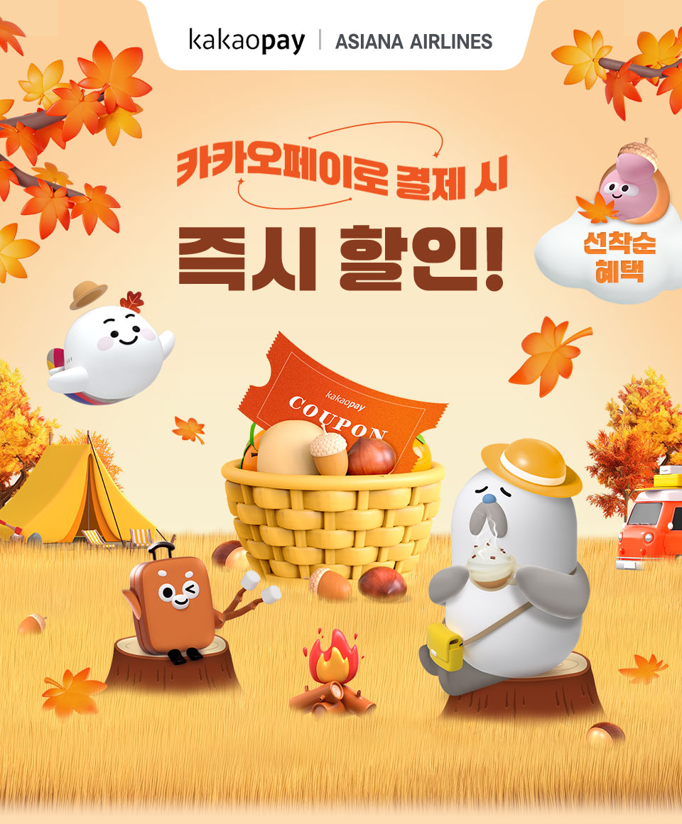 • 본 이벤트는 아시아나항공 홈페이지, 모바일 앱 또는 웹 채널에서 카카오페이 결제 시에만 사용 가능합니다.