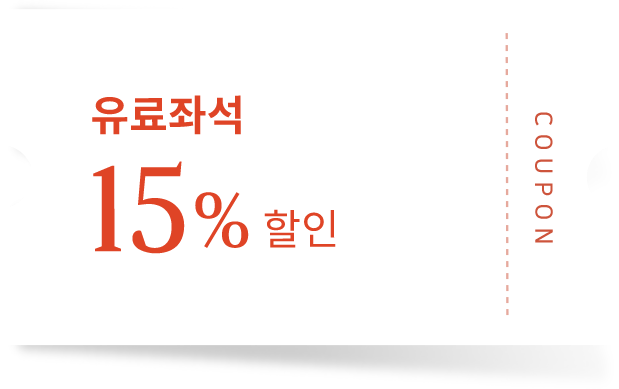 • 온라인에서는 유료좌석 5% 할인이 상시 적용되므로 15% 적용 시에는 5% 할인 금액에서 추가 10% 할인이 적용됩니다.